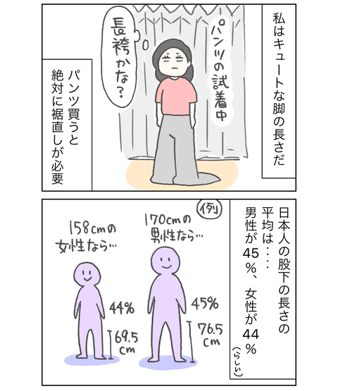 脚の長さを測ってみました 2021年08月20日 時々、脚が短いことをネタにしている私ですが↓例えばコチラの記事↓ 今回はさらに踏み込んだお話になります。パーセンテージにすると43%なのです。(股下69 ÷ 身長160 × 100 で算出)女性の平均が44%だから「な〜んだ、1%短いだけなんだ!」と一瞬思いましたが…たかが1 ... 続きを読む